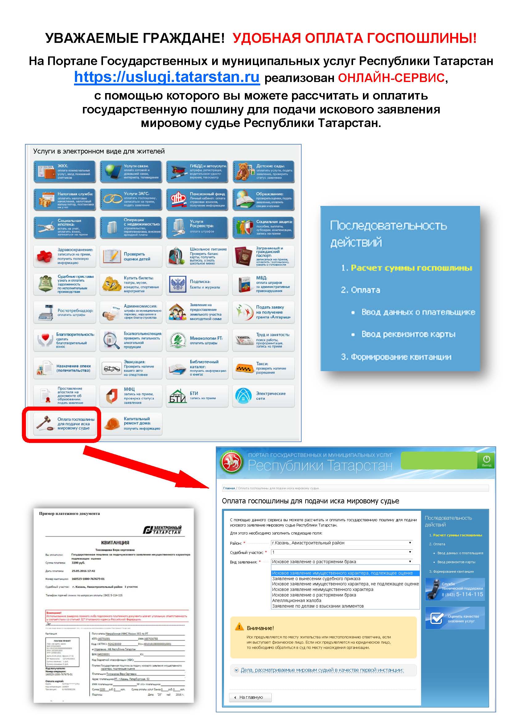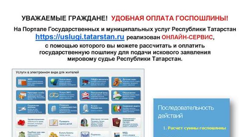 Уважаемые жители Ютазинского района! Информируем о том, что Министерством юстиции Республики Татарстан совместно с Министерством информатизации и связи Республики Татарстан разработан и внедрен сервис оплаты государственной пошлины в электронном виде по делам, рассматриваемым мировыми судьями республики. Сервис функционирует на Портале государственных и муниципальных услуг Республики Татарстан с декабря 2016 года, позволяет быстро и без комиссии оплачивать государственную пошлину.