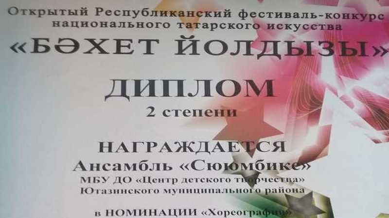 25 ноября воспитанники хореографического коллектива "Сююмбике" Центра детского творчества (руководитель Ахмадышина А.В.) приняли участие в Открытом Республиканском фестивале - конкурсе национального татарского искусства "Бэхет йолдызы" в г.Набережные Челны.