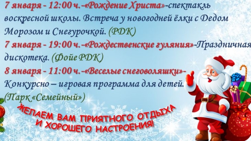 7 декабря, в РДК в 12:00 часов , состоится рождественский спектакль в исполнении учащихся воскресной школы. По окончании спектакля, в фойе, присутствующих ожидает встреча с Дедом Морозом, Снегурочкой, сказочными персонажами, а также сладкие подарки от Деда Мороза.