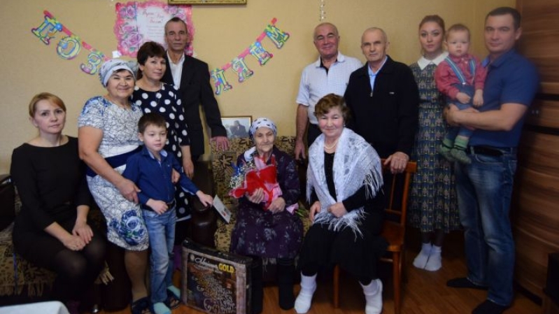 Вдова фронтовика Сайма-ханум Мухаметзянова принимает поздравления в связи с 90-летним юбилеем.