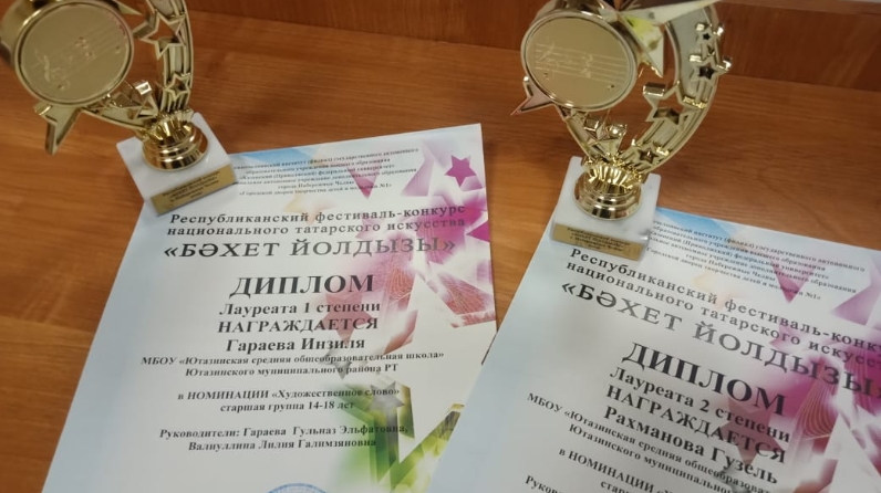 Поздравляем с победой учащихся Ютазинской СОШ Гараеву Инзилю и Рахманову Гузель с дипломами II степени Республиканского фестиваля конкурса национального театрального искусства"Бәхет йолдызы", прошедшего сегодня в г.Набережные Челны.