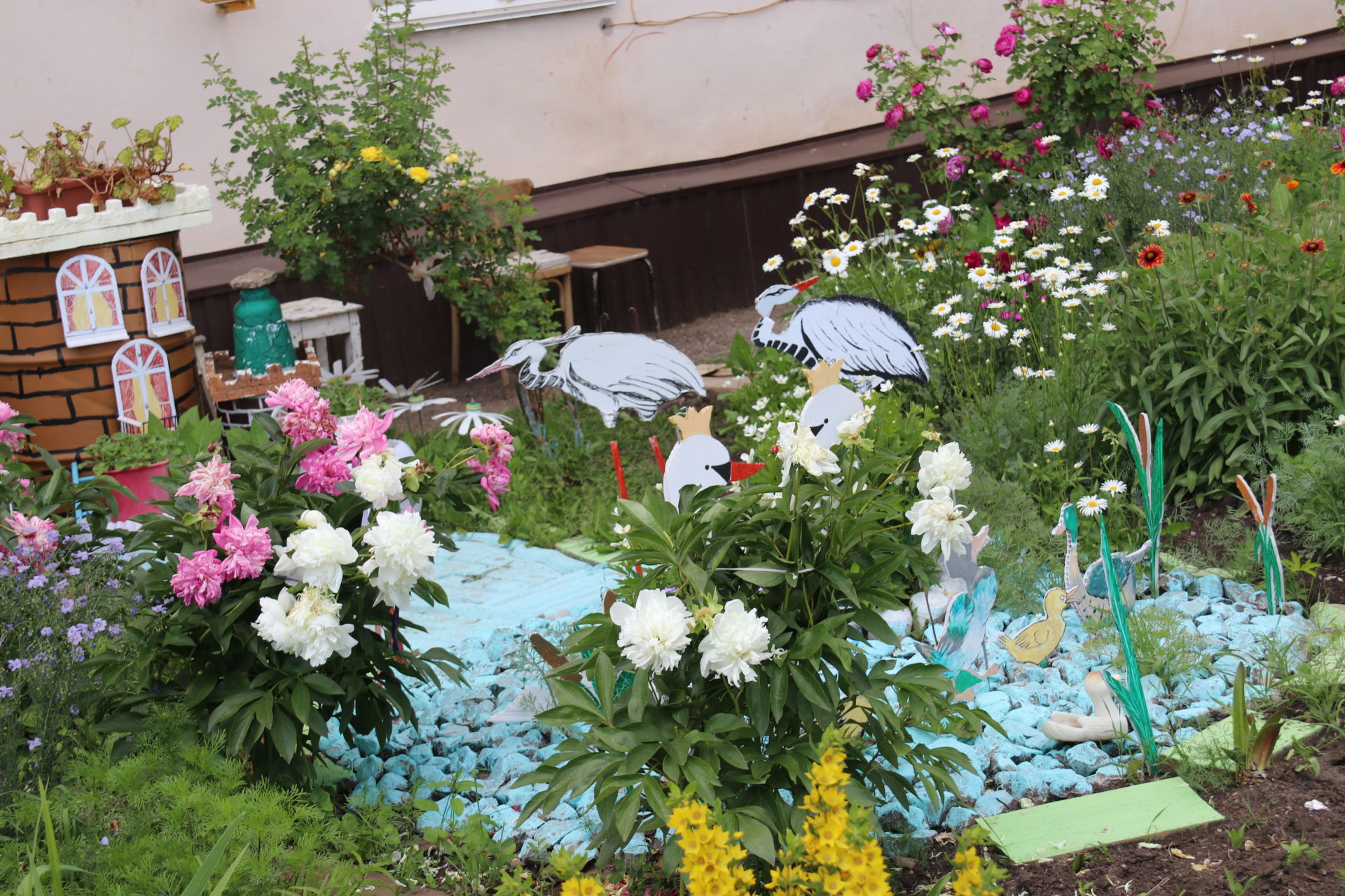 Двор дома № 105 на улице Пушкина районного центра можно взять за образец благоустройства для многих. Придомовая территория утопает в цветах, которые посадили жители. Внутри палисадника, превращенного в цветник, они своими руками создали голубой “водоем” с “утками”, “камышами”. Жители этого двухэтажного дома создали для себя красивый уголок для души. И прохожим он дарит хорошее настроение.