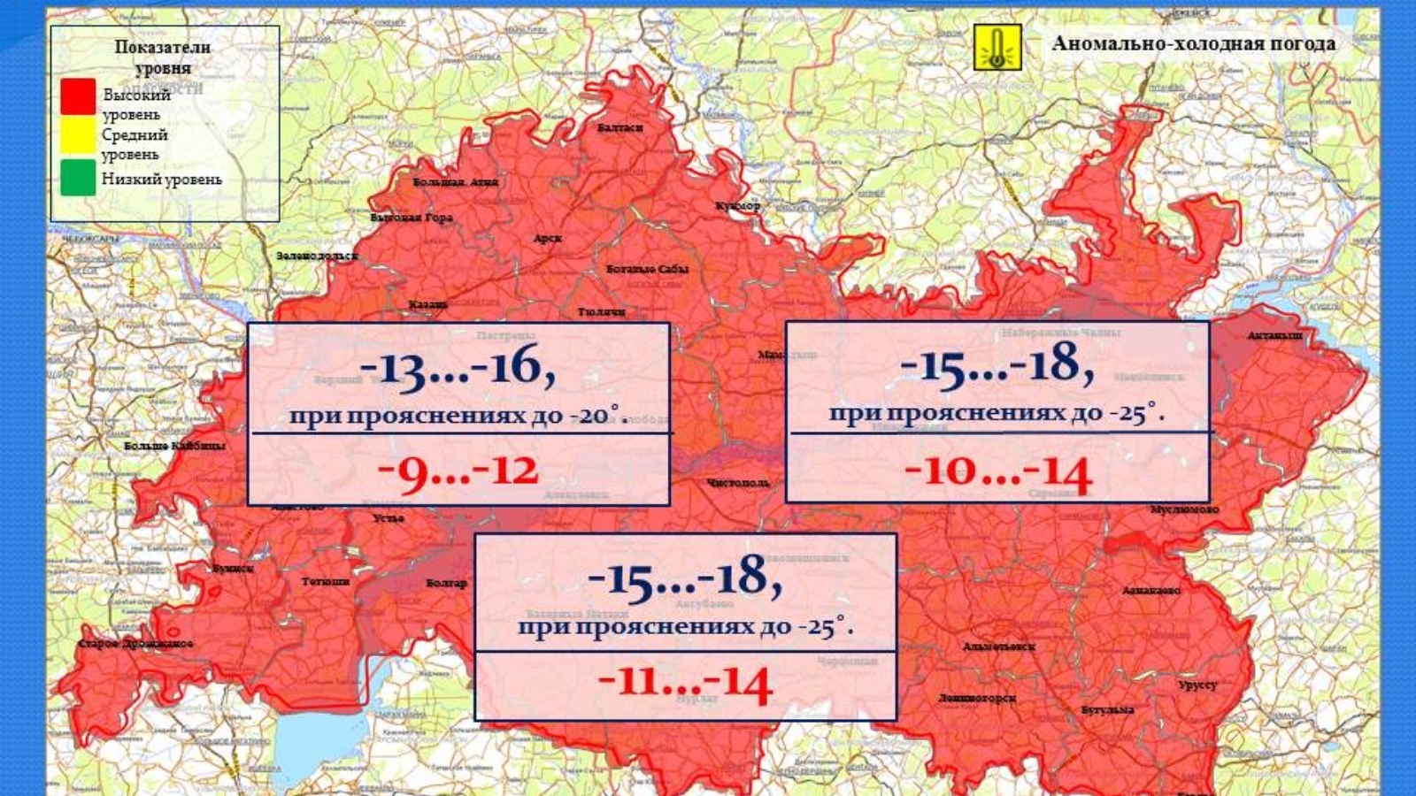 На территории Республики Татарстан местами с 3 по 10 декабря 2020 года наблюдается аномально-холодная погода со среднесуточными температурами воздуха на 9-17° ниже климатической нормы, с минимальными температурами до -20..-25°, в отдельных районах до -28°. Аномально-холодная погода в республике сохранится по 14 декабря 2020 года.