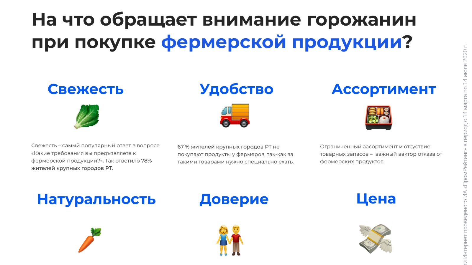 В целом более 80% опрошенных горожан из Татарстана заявили о своем положительном отношении к фермерской продукции, которую считают экологически чистой и более натуральной в отличие от той, что продается в магазинах (опрос также показал, в каких именно магазинах чаще закупаются горожане, пополняя свою продуктовую корзину).