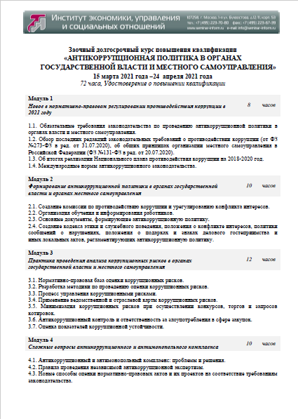В связи с востребованностью заочного формата обучения и актуальностью затрагиваемых вопросов с 15 марта 2021 года по 24 апреля 2021 года пройдет долгосрочный курс повышения квалификации для руководителей и заместителей руководителей органов местного самоуправления и администраций муниципальных образований по программе: «Антикоррупционная политика в органах государственной власти и местного самоуправления».