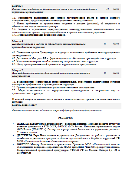 В качестве экспертов повышения квалификации выступят представители МОО «Национальный комитет общественного контроля», Московского антикоррупционного комитета при Московской торгово-промышленной палате, эксперты в области корпоративной безопасности и управлению рисками.