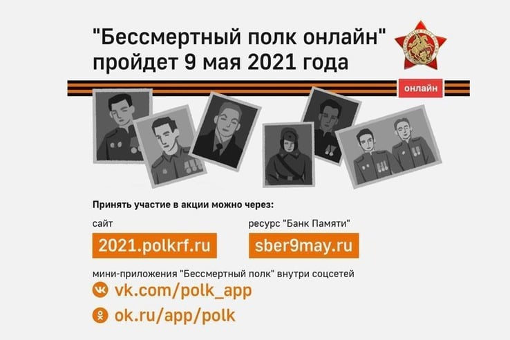 9 мая 2021 в День Победы акция «Бессмертный полк» пройдет в онлайн-формате на двух сайтах: федеральном 2021.polkrf.ru и томском официальном сайте движения moypolk.ru.
