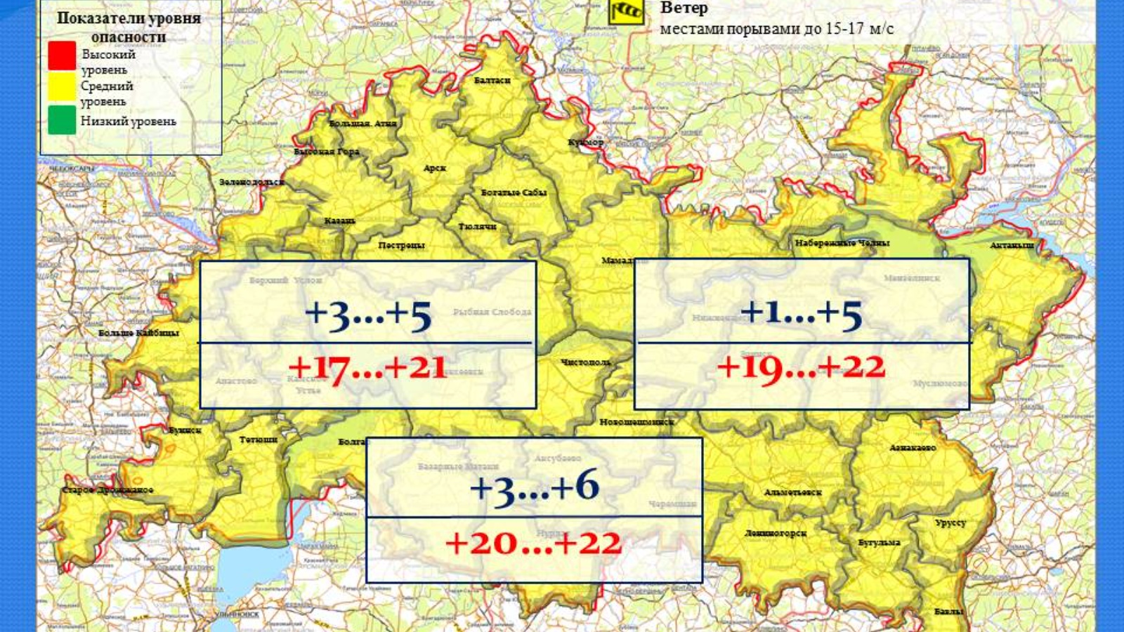 Неблагоприятные метеорологические : Днем 3 мая 2021 года на территории Республики Татарстан местами ожидается сильный южный, юго-восточный ветер порывами 15-17 м/с (в Казани до 15 м/с).