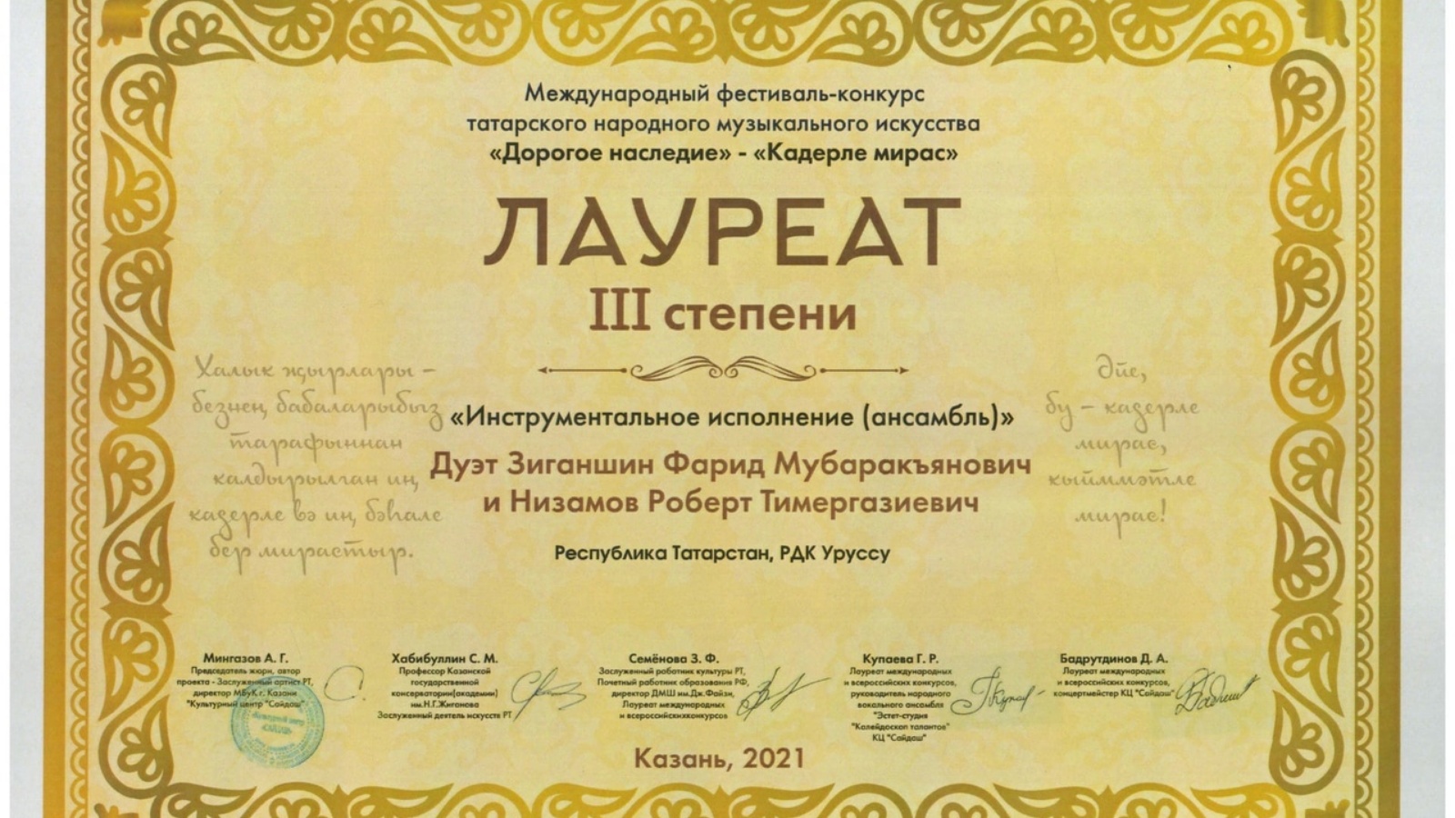 в номинации «Инструментальное исполнение (ансамбль)» дуэт Зиганшин Фарид и Низамов Роберт стали Лауреатом