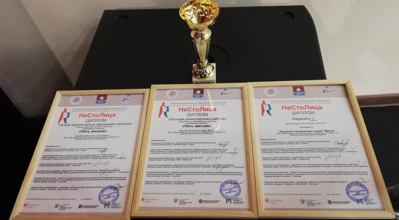 Народная театральная студия «Маски» (рук. Г.Р. Ханнанова) со спектаклем «Пять жизней», поставленным по повести Б. Васильева «А зори здесь тихие», покорила сердца жюри и стала Лауреатом 1 степени во II Республиканском детско-юношеском и молодёжном театральном фестивале-конкурсе «НеСтоЛица», который проходил 22-23 мая в г.Бугульма.