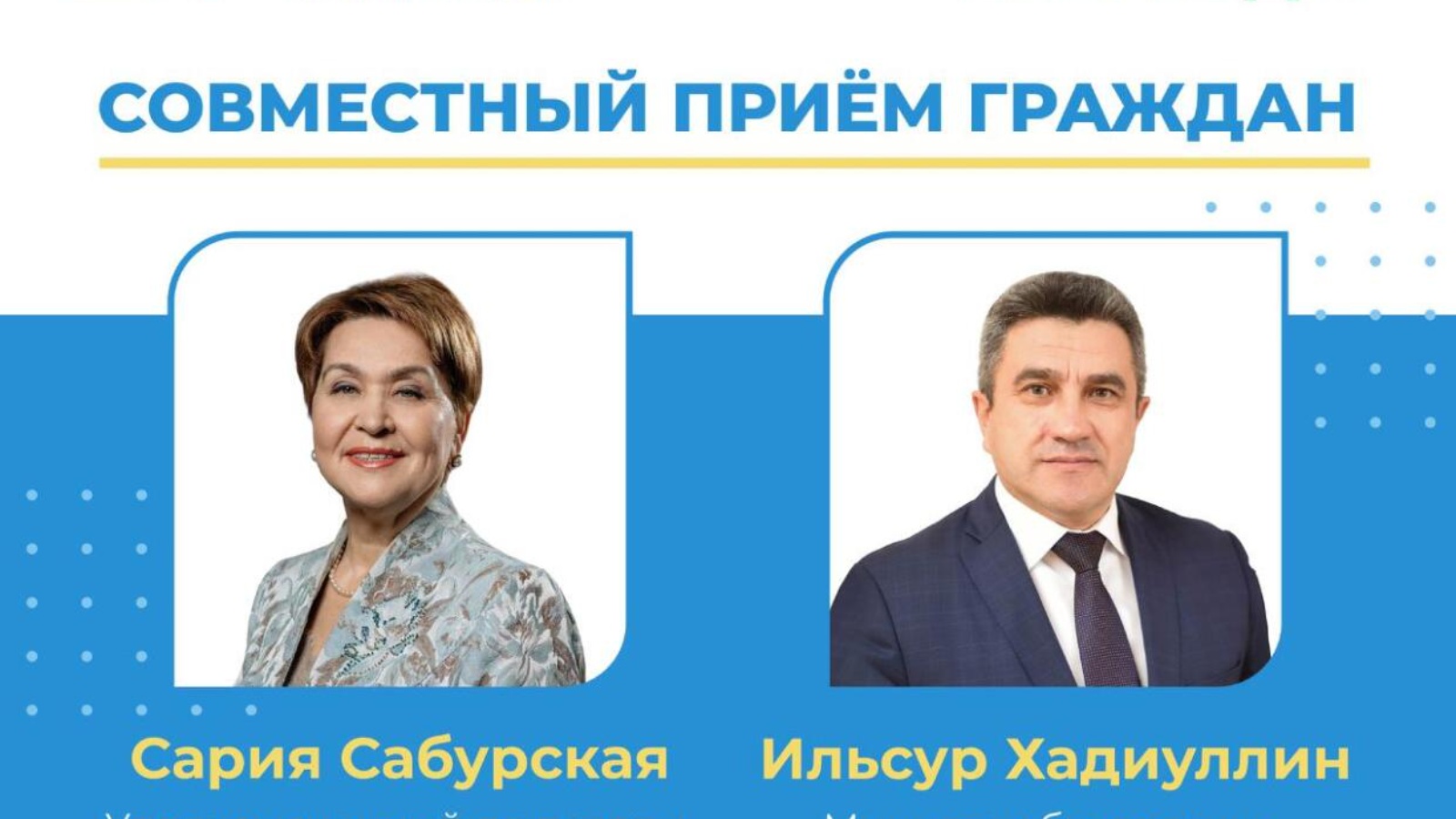 31 мая 2021 года с 14.00 до 16.00 в Аппарате Уполномоченного по правам человека в Республике Татарстан (г. Казань, ул. Карла Маркса, д. 61) состоится совместный прием граждан Уполномоченным по правам человека в Республике Татарстан и министром образования и науки Республики Татарстан Также у жителей муниципальных районов республики будет возможность задать свои вопросы Сарие Сабурской и Ильсуру Хадиуллину посредством прямого подключения через программу «Skype» в приемных общественных помощников Уполномоченного по правам человека в Республике Татарстан в муниципальных образованиях республики.