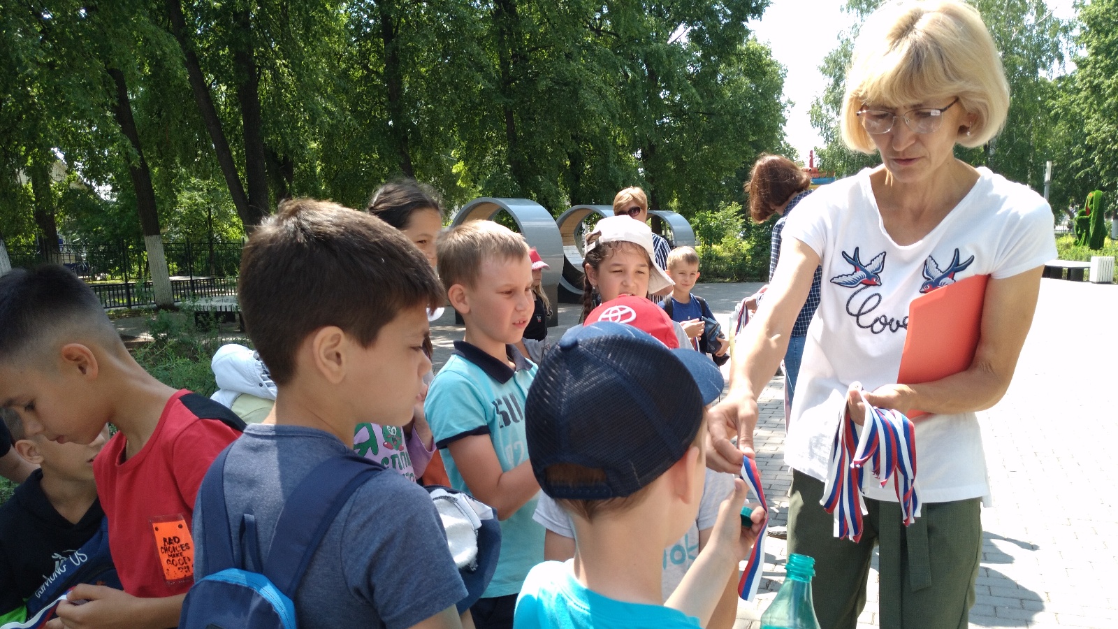 Также, ребята активно приняли участие в викторине, вопросы которой были посвящены истории страны, традициям, символам российской государственности, отгадывали загадки, соревновались в знании пословиц. Затем всем отдыхающим в парке были розданы информационные буклеты, посвящённые истории праздника, магнитики, ленточки триколор России.