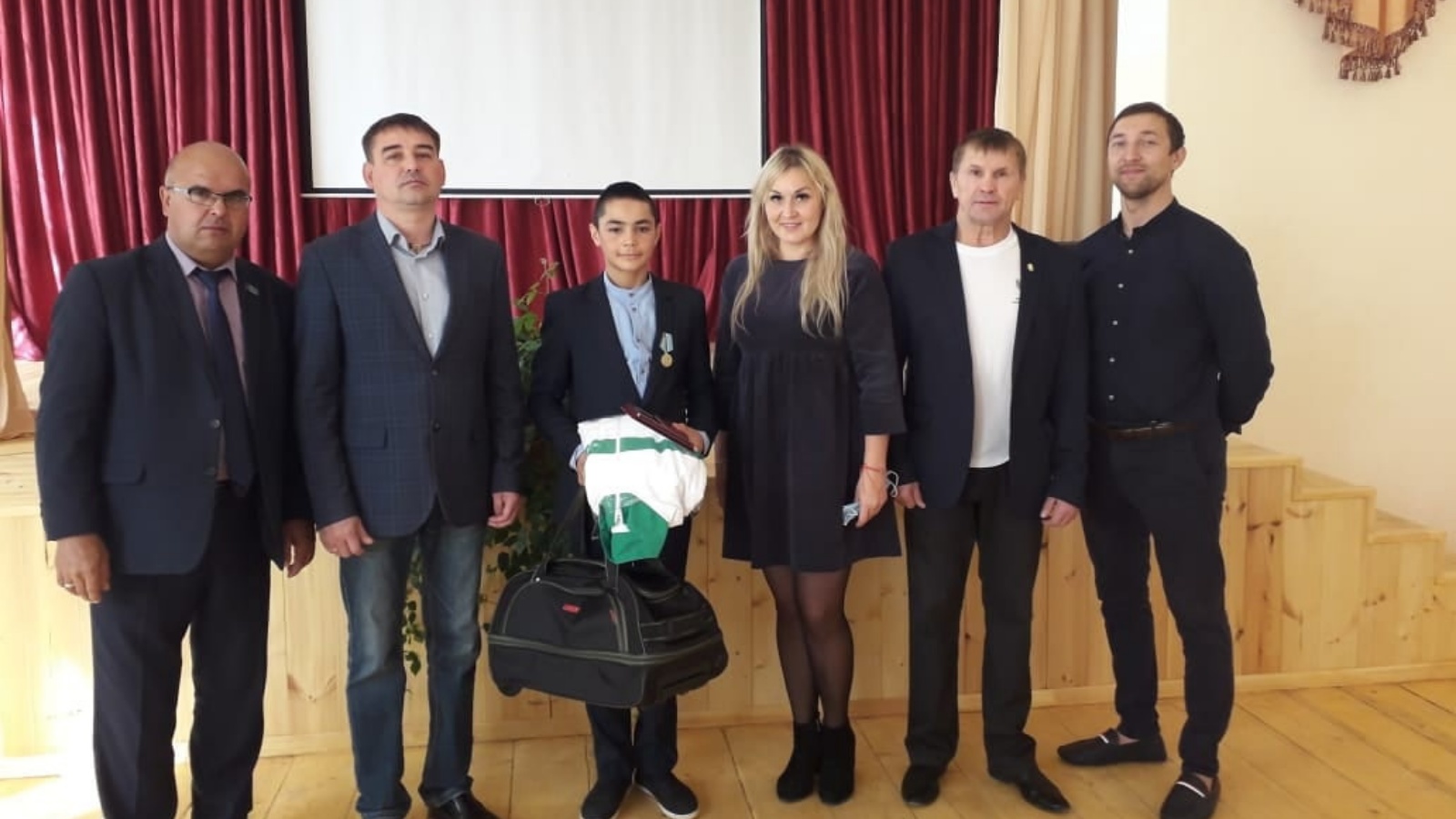 В актовом зале МБОУ"Ютазинская СОШ" состоялось торжественное чествование и награждение юбилейной медалью"30 лет Ютазинскому району" учащегося 8 класса школы Махмадшоева Шамиля за достигнутые успехи в спорте.