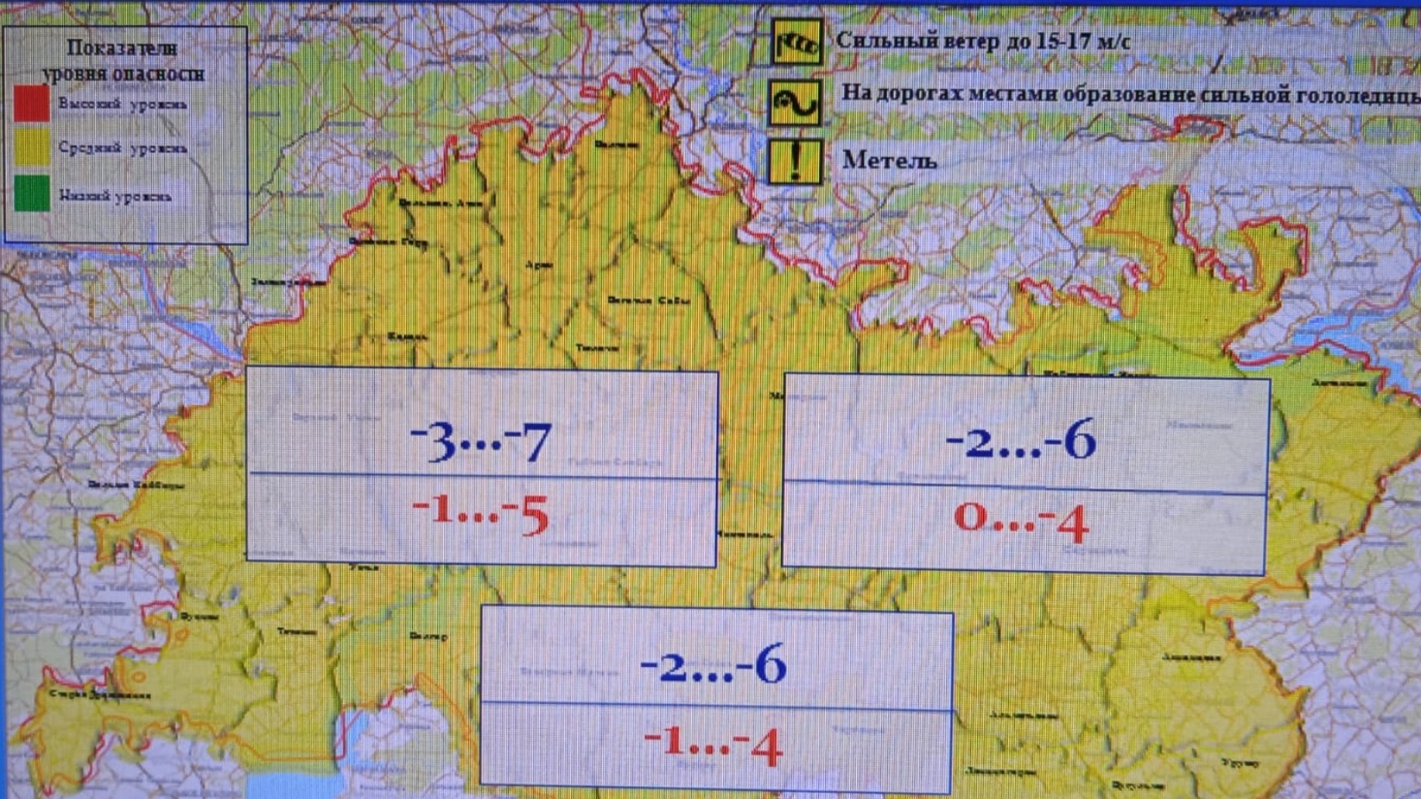 Облачно. Небольшой, местами умеренный снег .В отдельных районах метель.Ветер западный, северо-западный 6-11 м/с, местами порывами 15-17 м/с. Минимальная температура воздуха ночью -2..-6˚.Максимальная температура воздуха днем 0..-4˚. На дорогах гололедица, местами сильная.