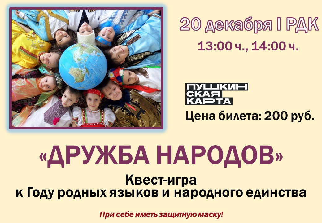 Квест-игра «Дружба народов» к Году родных языков и народного единства 20 декабря, 13:00 ч.; 14:00 ч., РДК.