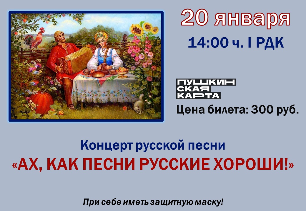 "Ах, как песни русские хороши!” Концерт русской песни 20 января, 14.00 ч., РДК Цена билета: 300 руб. Ссылка на покупку билетов: https://bileton.ru/events/koncert-russkoy-pesni-ah-ka..