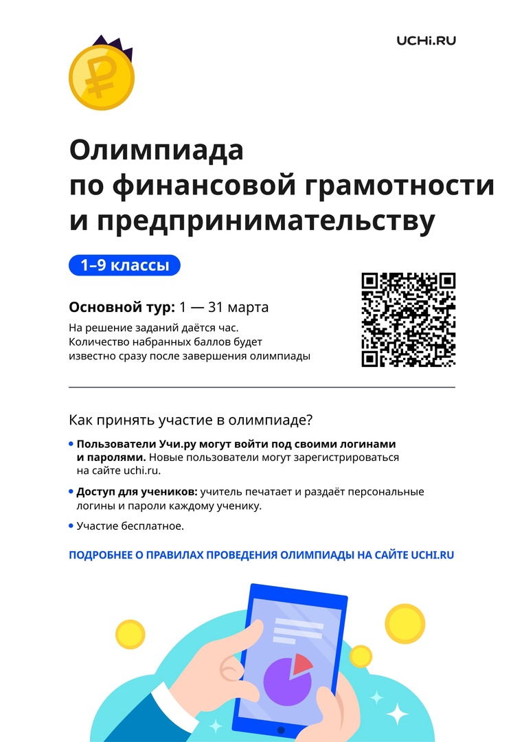 Всероссийская онлайн-олимпиада по финансовой грамотности и предпринимательству для школьников проводится на онлайн-образовательной платформе «Учи.ру».