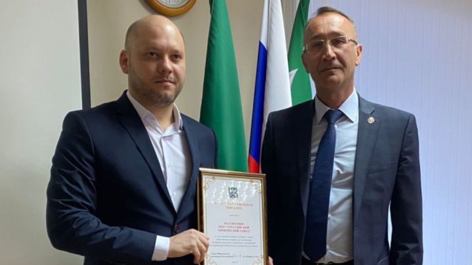 За многолетнее активное участие в охране общественного порядка при проведении культурно-массовых и спортивных мероприятий на территории Ютазинского муниципального района благодарственным письмом главы района поощрен коллектив ООО «Уруссинский химический завод». Награду вручили директору предприятия Нафису Шагалиеву.