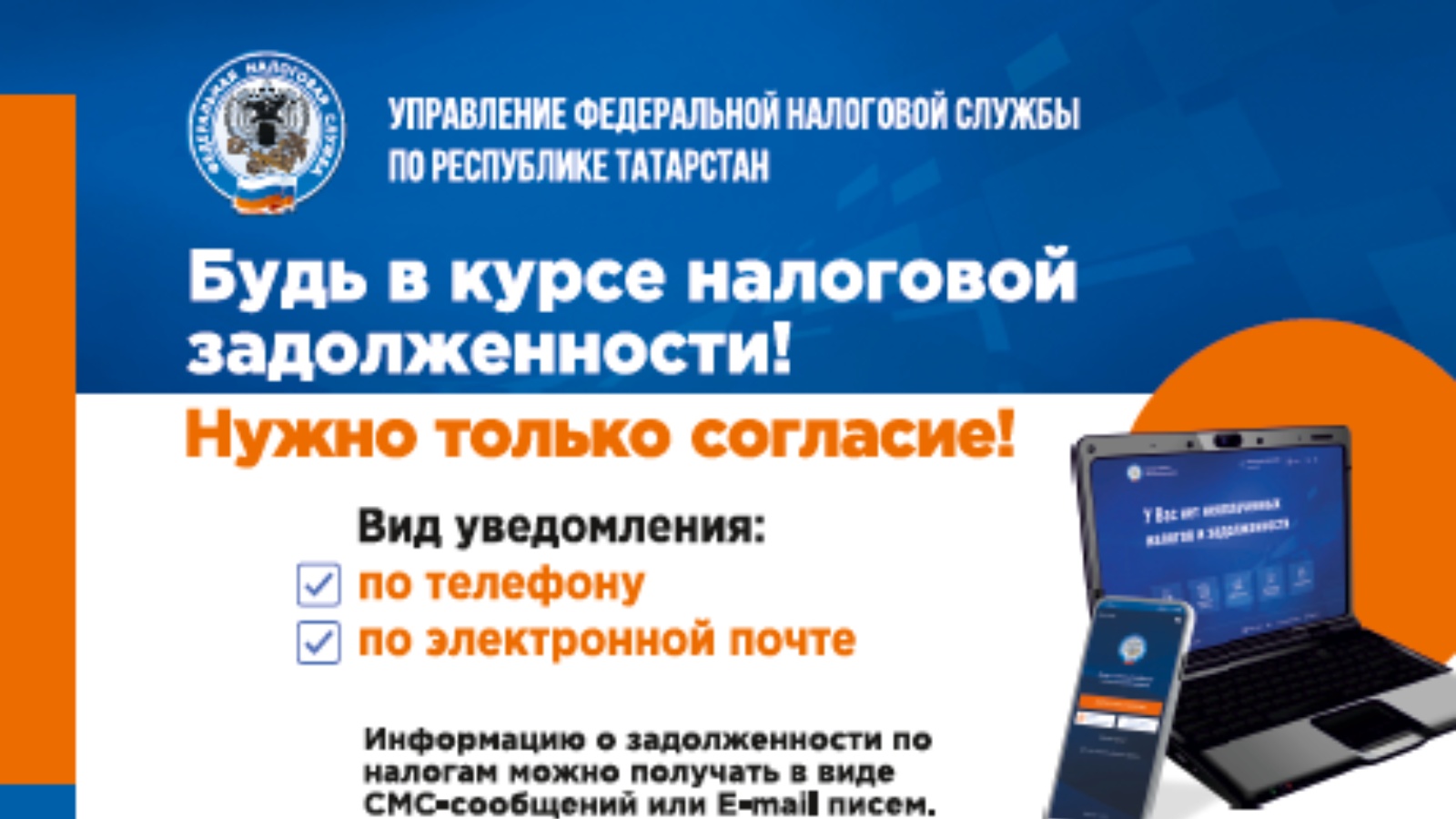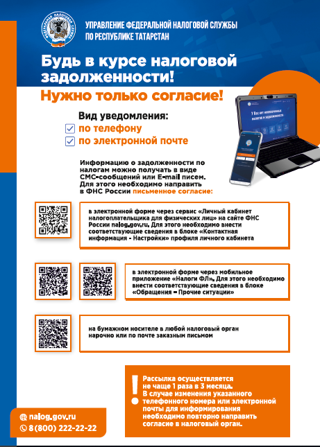 Дав свое согласие на информирование, налогоплательщик сможет получать информацию о задолженности по налогам в виде СМС-сообщений на телефон или E-mail писем на электронную почту. Рассылка осуществляется не чаще 1 раза в 3 месяца.