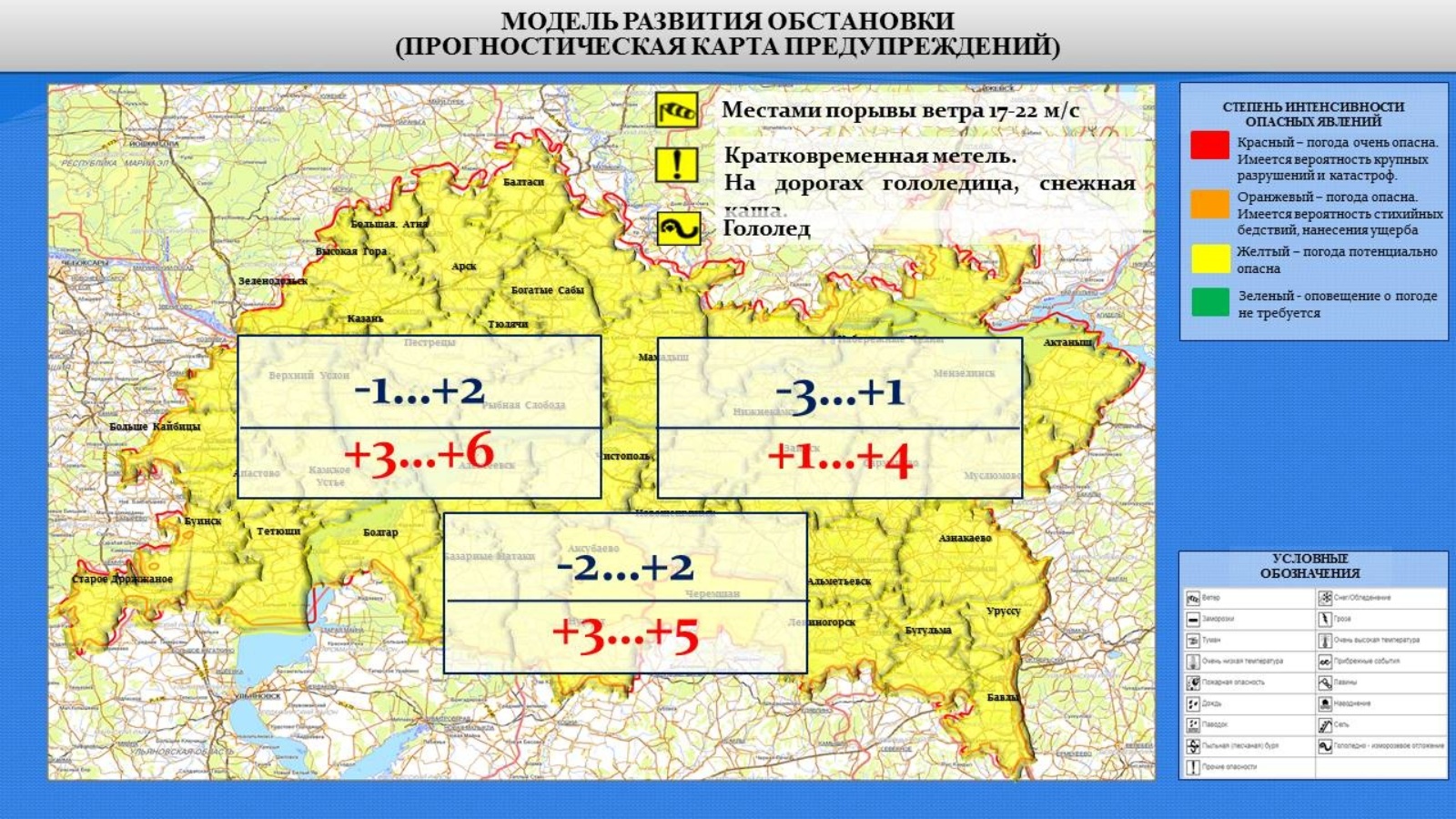 . Облачно с прояснениями. Осадки в виде снега, мокрого снега и дождя.Местами кратковременная метель и гололед. Ветер южный, юго-западный 9-14 м/с; местами порывами 17-22 м/с. Минимальная температура воздуха ночью -3..+1˚.Максимальная температура воздуха днем +1..+4˚. На дорогах местами гололедица и снежная каша.