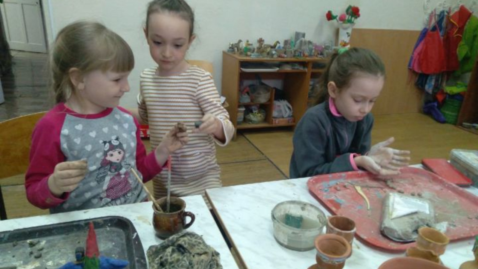 Вчера например, дети увлеченно учились лепить разнообразную посуду из глины.