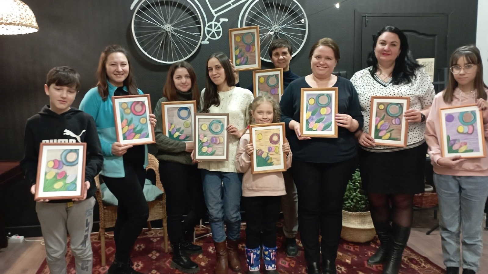 Здесь собрались любители искусства разных возрастов. Вместе с художницей Камиллой Корбовой мы создавали весенний натюрморт.
