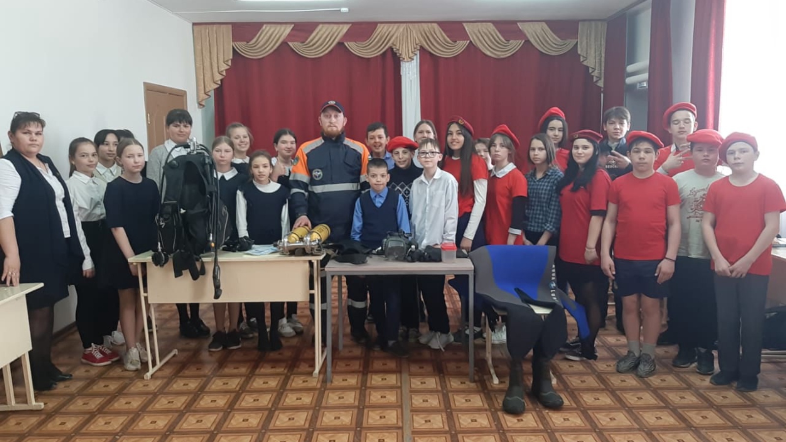 Дамир рассказал ребятам о своей профессии, о том, какими качествами должен обладать спасатель-водолаз, показал свои рабочие костюмы. Учащиеся были в восторге, задавали множество вопросов о его работе, хобби, о семье, об учёбе и даже примерили водолазные костюмы! Они почувствовали на себе всю тяжесть работы, ведь одно только обмундирование весит около 50 кг. Время пролетело быстро и интересно, ребята задавали .