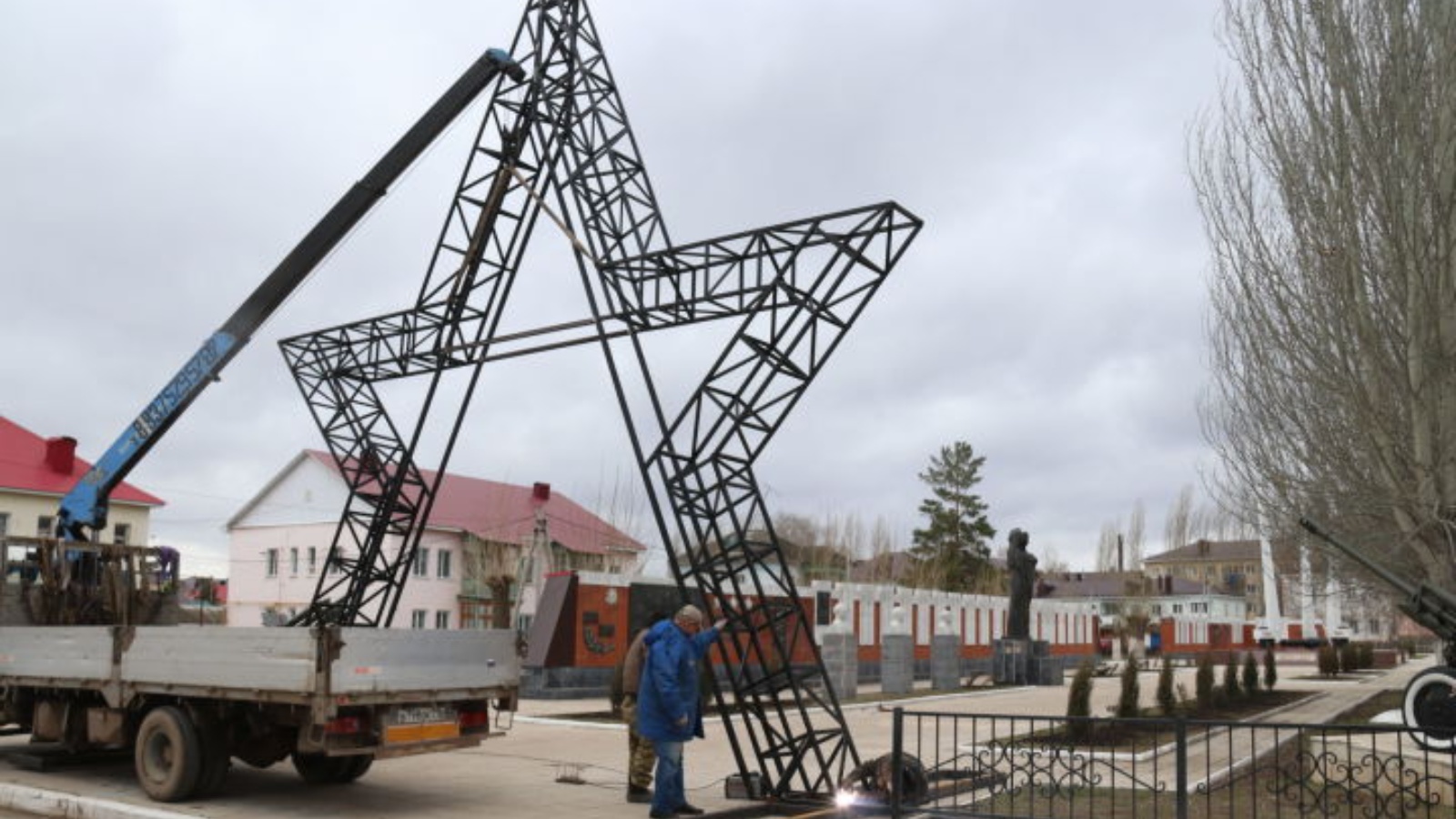 Сегодня в поселке Уруссу у входа в сквер Победы произвели установку железной конструкции «Пятиконечная звезда».