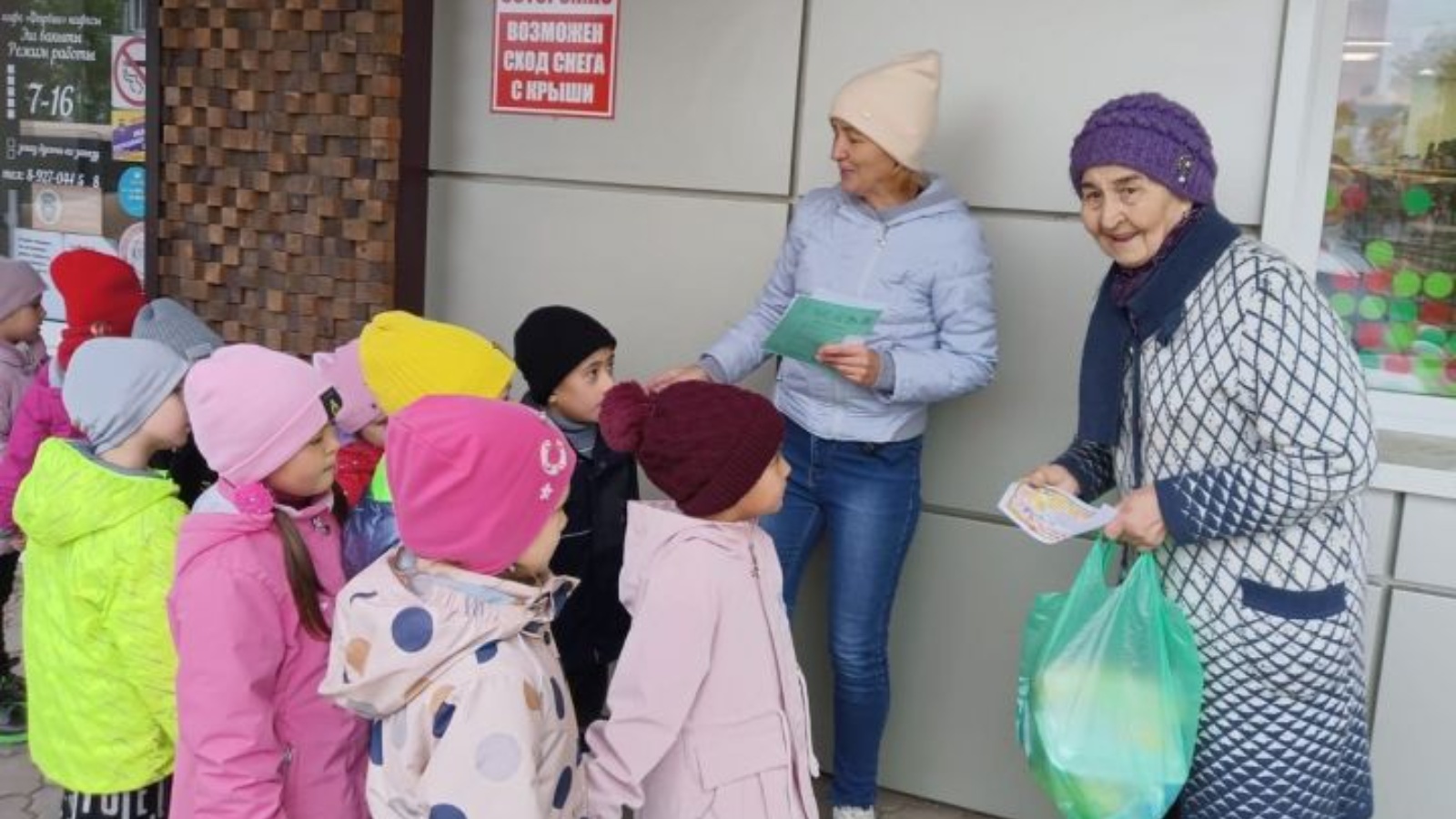 Дети старшей, подготовительной, логопедической групп и воспитатели вышли на улицы нашего поселка и поздравляли старшее поколение с праздником, дарили открытки, рассказывали стихи, раздали праздничные листовки.