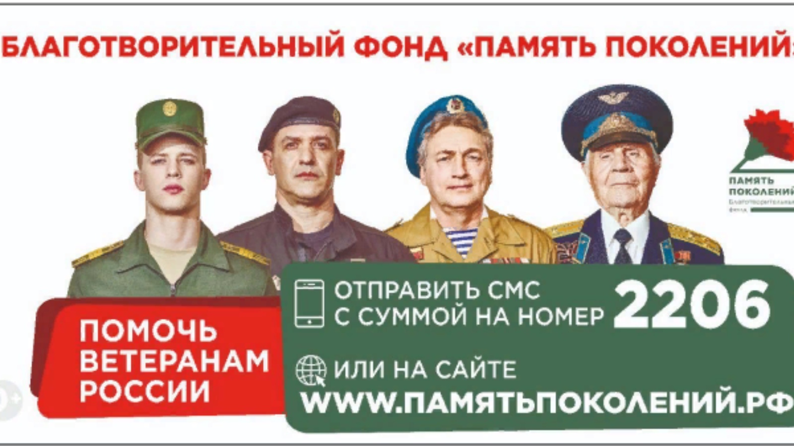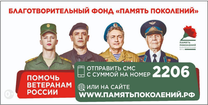 Благотворительный фонд «ПАМЯТЬ ПОКОЛЕНИЙ» (далее – «Фонд») – некоммерческая организация, оказывающая медицинскую помощь ветеранам боевых действий. Миссия Фонда - объединить в деле помощи ветеранам всех граждан России без исключения, независимо от их возраста, пола, социального положения, дохода, политических, религиозных и других взглядов. Деятельность Фонда имеет высокую социальную значимость: в настоящее время помощь оказана более 17 300 ветеранам по все территории России. Фонд приобретает для них инвалидные коляски, лекарства, протезы, слуховые аппараты, а также организует дорогостоящие операции и реабилитационное лечение. За 7 лет работы Фонд поддержал более 110 учреждений медицинской и социальной сферы, в которых проходят лечение или на постоянной основе проживают ветераны: данные учреждения получили высокотехнологичное медицинское оборудование и средства реабилитации. Общая сумма помощи от Фонда составляет свыше 2 млрд 549 млн рублей.