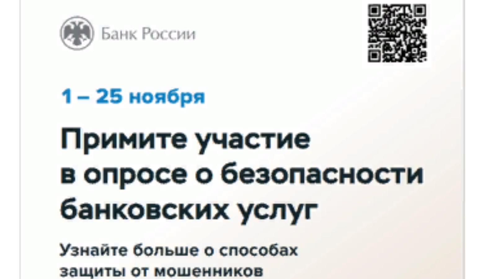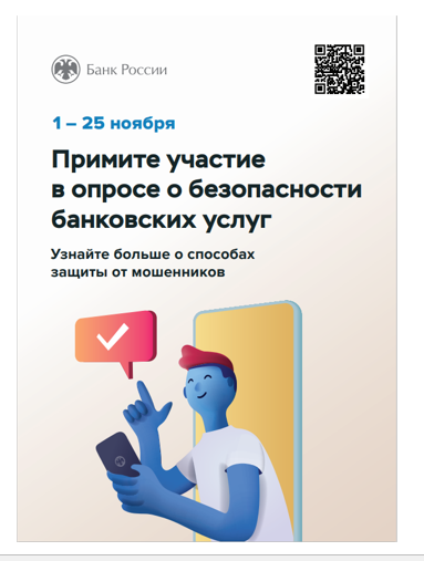 Банком России в целях повышения финансовой грамотности, защищенности и удовлетворенности потребителей услугами финансовых организаций проводится опрос для определения уровня доверия клиентов к безопасности реализуемых электронных технологий и сервисов.