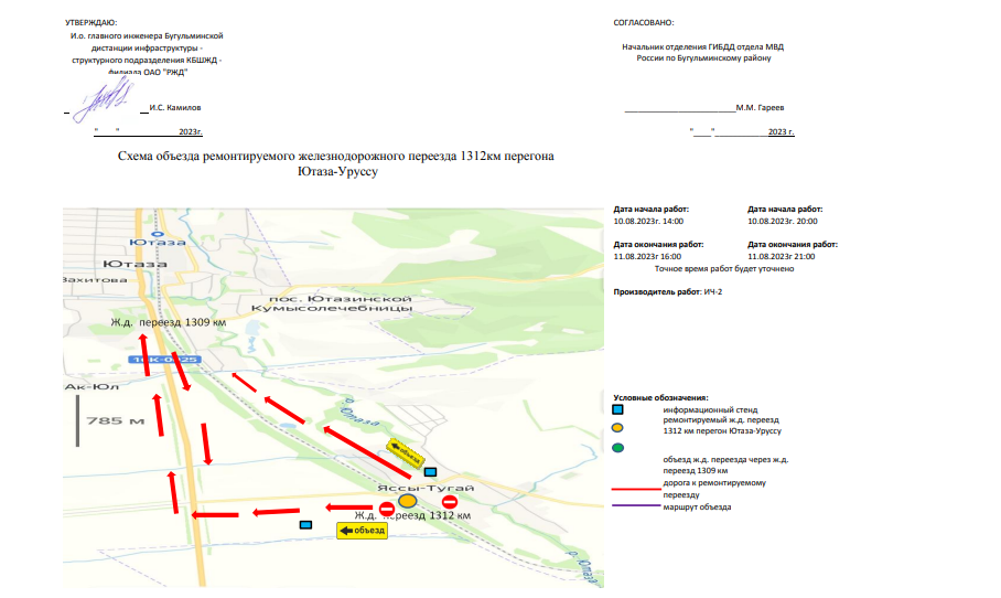 В связи с производством работ 10 августа с 14:00 до 20:00 и 11 августа с 16:00 до 21:00, железнодорожный переезд 1312 км с дежурным работником, расположенный на перегоне Ютаза-Уруссу (автодорога Уруссу-Ютаза межмуниципальная региональная, слева н.п. Яссы-Тугай) будет закрыт. Объезд автотранспорта будет осуществляться по проселочной дороге согласно схемы.