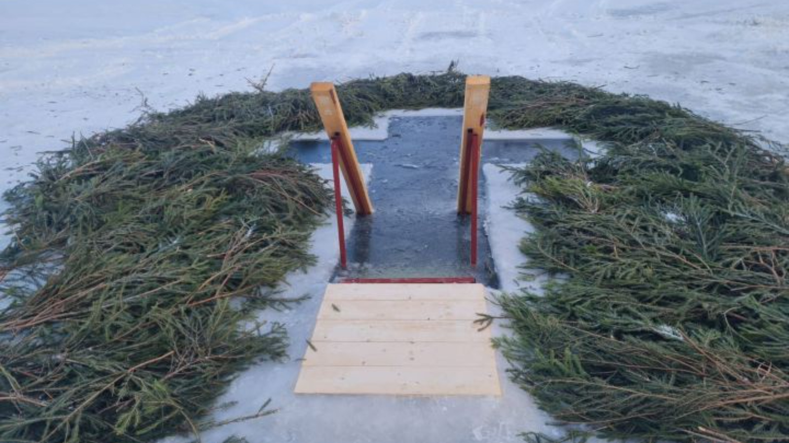 Установлены новые переодевалки, а прорубь в форме креста обложена еловыми ветками. Кроме того, весь путь от переодевалки до купели устлан соломой, согласно старинным русским обычаям.