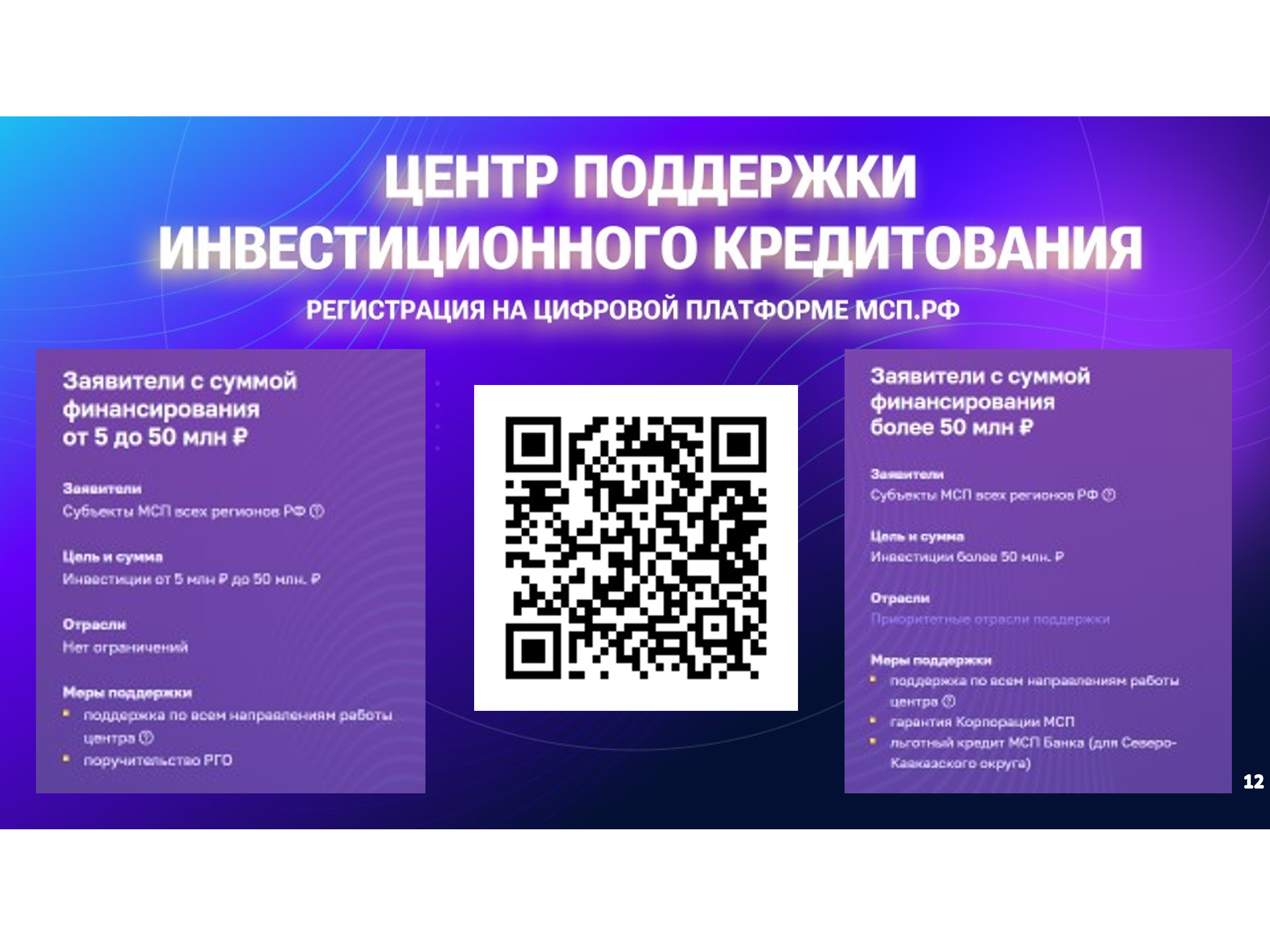 В 2023 году на Цифровой платформе МСП.РФ запущен сервис «Центр поддержки инвестиционного кредитования» по сопровождению инвестиционных проектов субъектов MCП и выработке рекомендаций по подготовке документов и структурированию сделок в целях инвестиционного кредитования.