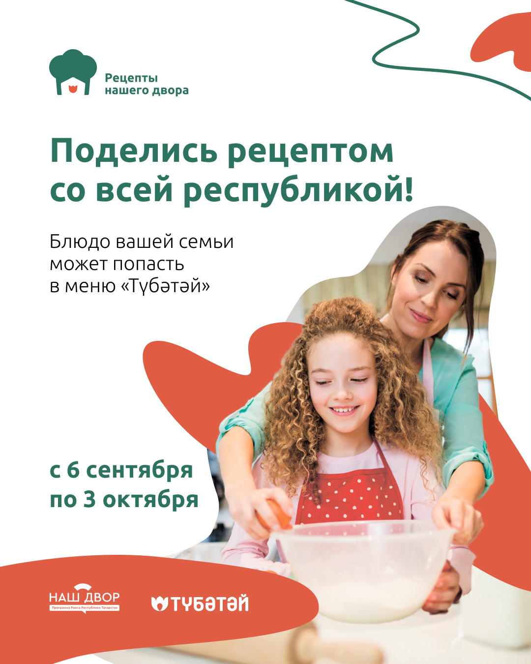 Конкурс «Рецепты нашего двора» ищет лучшие татарские рецепты в двух номинациях: «Лучший традиционный татарский рецепт» и «Лучший авторский татарский рецепт». Заявки на участие принимаются с 5 сентября по 3 октября через телеграм-бот @TBT_Family_bot или в любом ресторане «Тюбетей» в Казани. Участники конкурса могут подать свои рецепты в удобной для них форме — текст, видео или фото: это позволит участвовать в конкурсе большему числу людей.