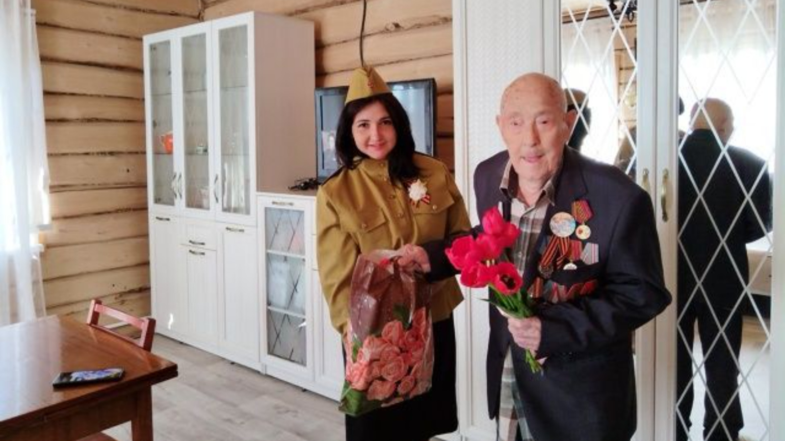 Во время встречи участники акции выразили глубокую благодарность ветерану за его мужество и героизм, вручили цветы и памятные подарки, а также с теплотой пообщались, выслушав его воспоминания о военных годах.