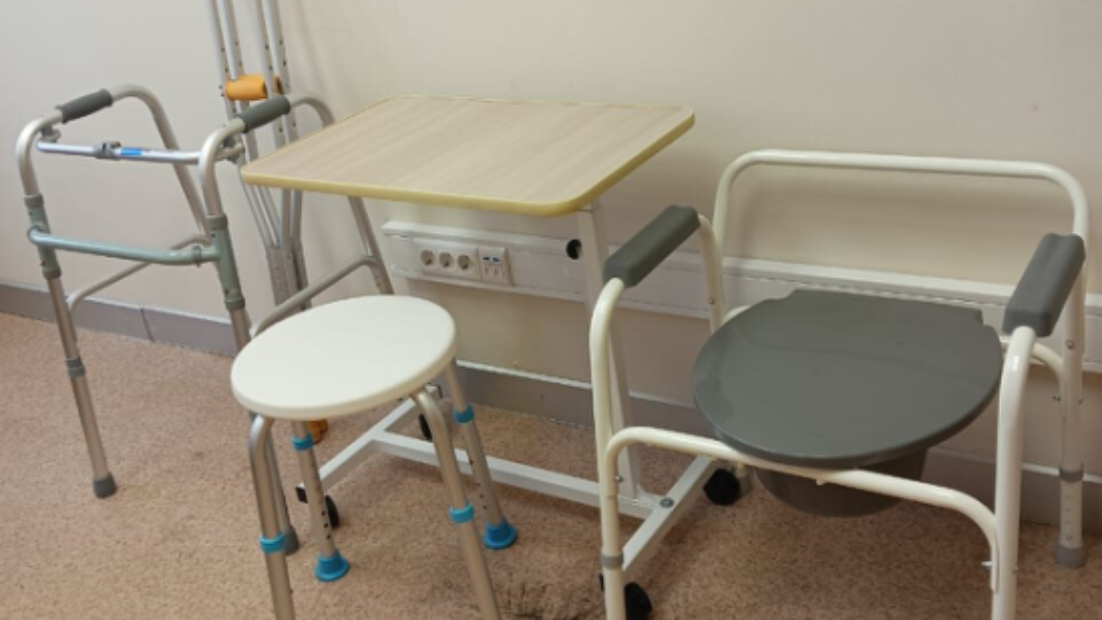 Средства реабилитации представлены функциональной медицинской кроватью, противопролежневым матрасом, складной механической кресло-коляской. А также в пункте проката имеются костыли подмышечные металлические, трость опорная с функцией по регулированию высоты, ходунки, кресло-туалет медицинский, столик прикроватный, стул для ванн/душа, подголовник для мытья головы.
