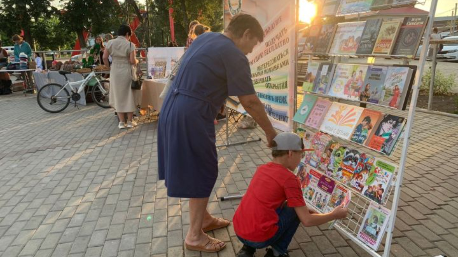 На площади перед Районным Домом Культуры Центральная и Центральная Детская библиотеки представили выставку книг под названием «Дружим с книгой всей семьей».