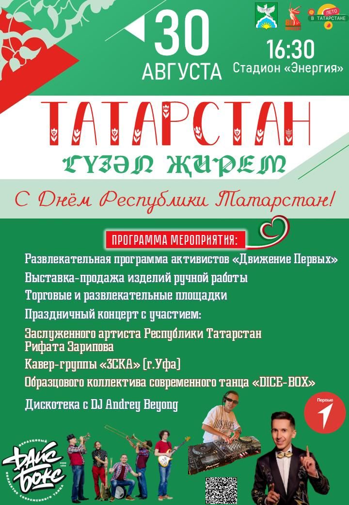 Приглашаем Вас на праздничные мероприятия, посвященные Дню Республики Татарстан, которые состоятся 30 августа 2025 года на стадионе «Энергия». Начало мероприятий: 16:30 час.