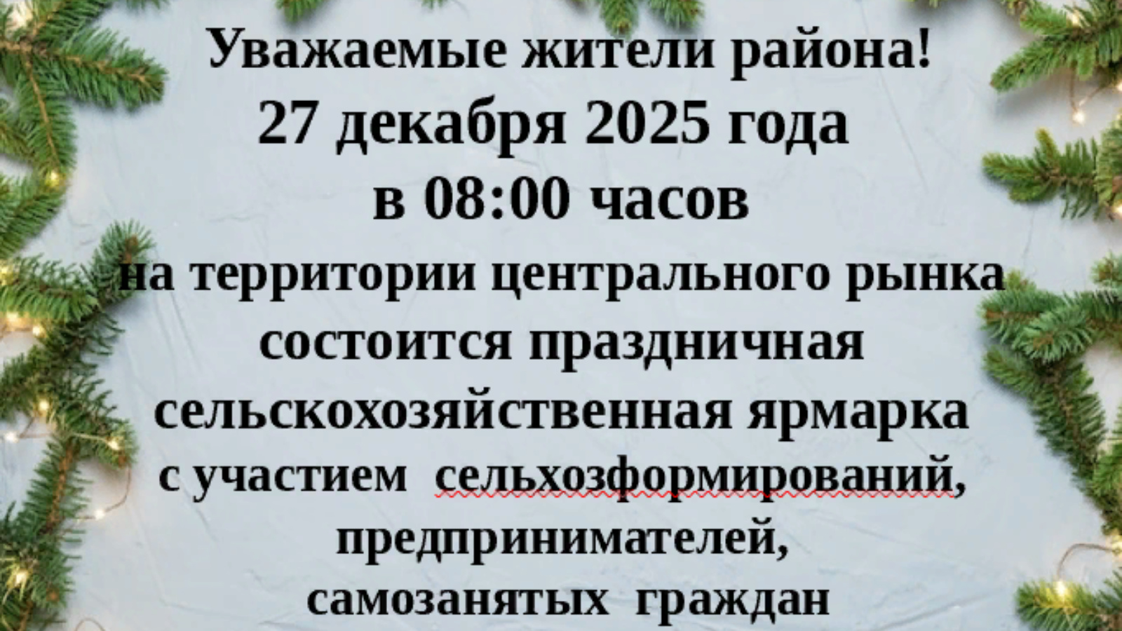 27 декабря 2025 года в 08:00 часов пройдет праздничная сельскохозяйственная ярмарка с участием сельхозформирований, предпринимателей, самозанятых граждан.