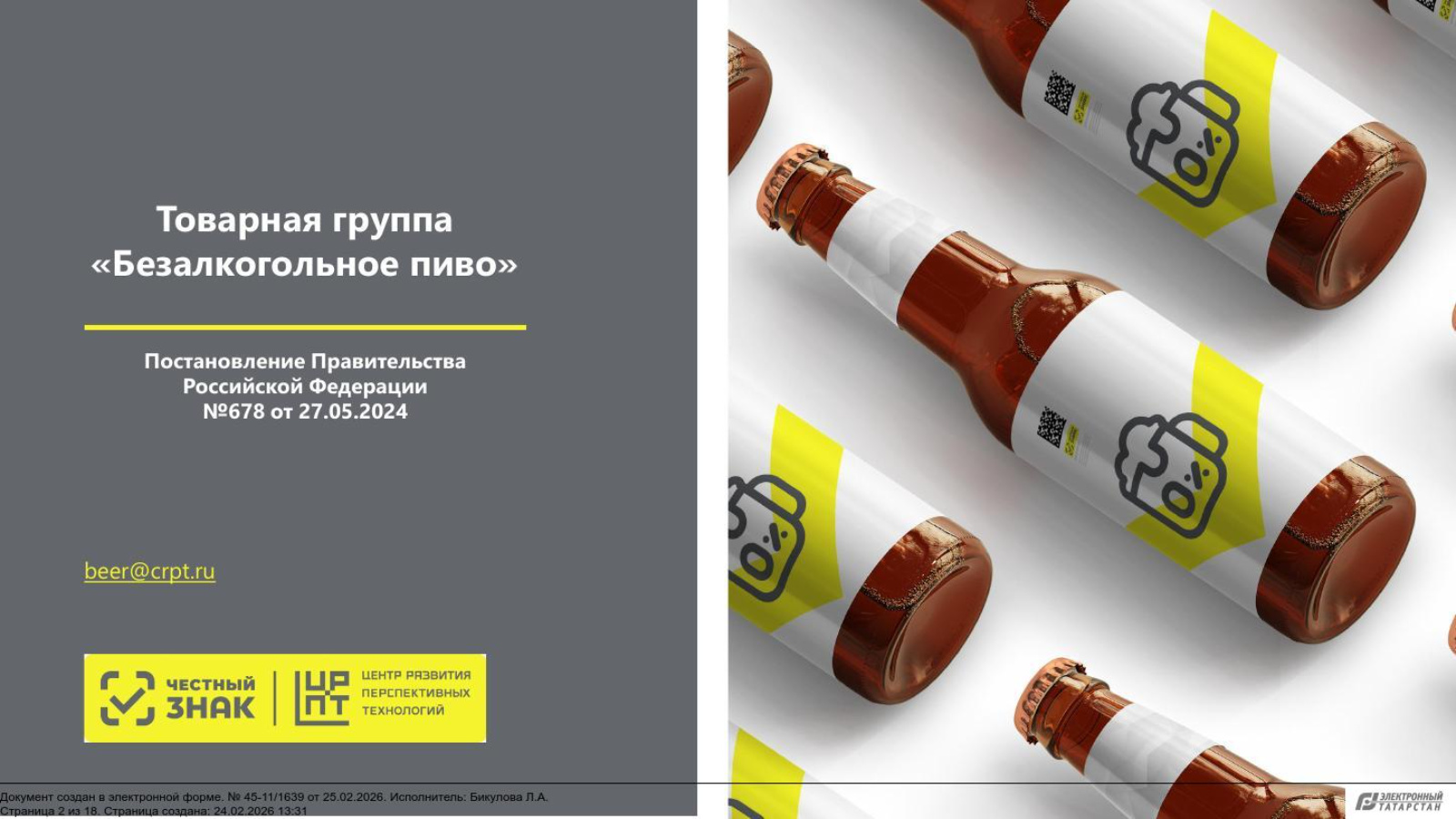 Согласно постановлению Правительства Российской Федерации от 27.05.2024 № 678 с 01.03.2026 вступают в силу требования о предоставлении в информационной системе маркировки сведений об обороте безалкогольного пива и о выводе из оборота безалкогольного пива путем, не являющимся розничной продажей.