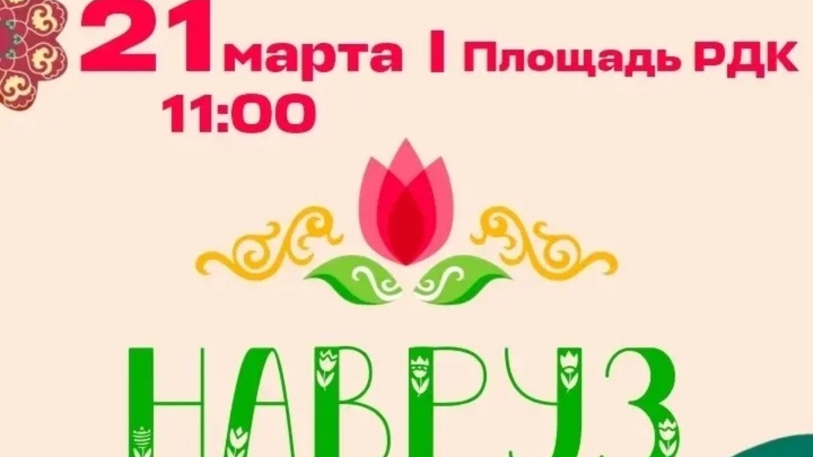 21 марта в 11 часов на площади РДК Вас ждут: • Яркие концертные номера • Веселые игры и народные забавы • Вкусная каша и угощения Приходите всей семьей! Навруз – праздник обновления и радости!