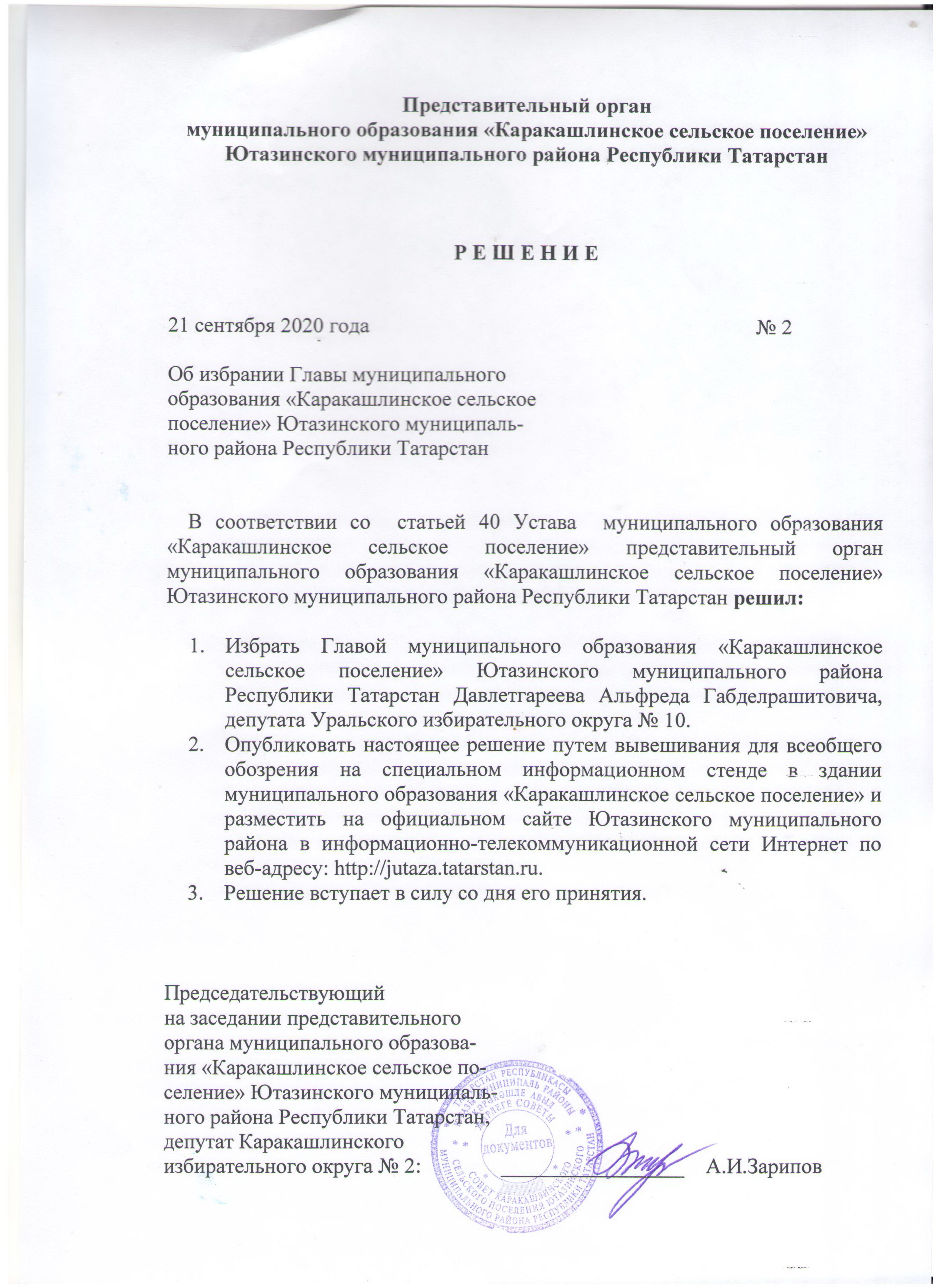 Решение Совета поселения от 21.09.2020г. № 2 «Об избрании Главы муниципального образования «Каракашлинское сельское поселение» Ютазинского муниципального района Республики Татарстан»