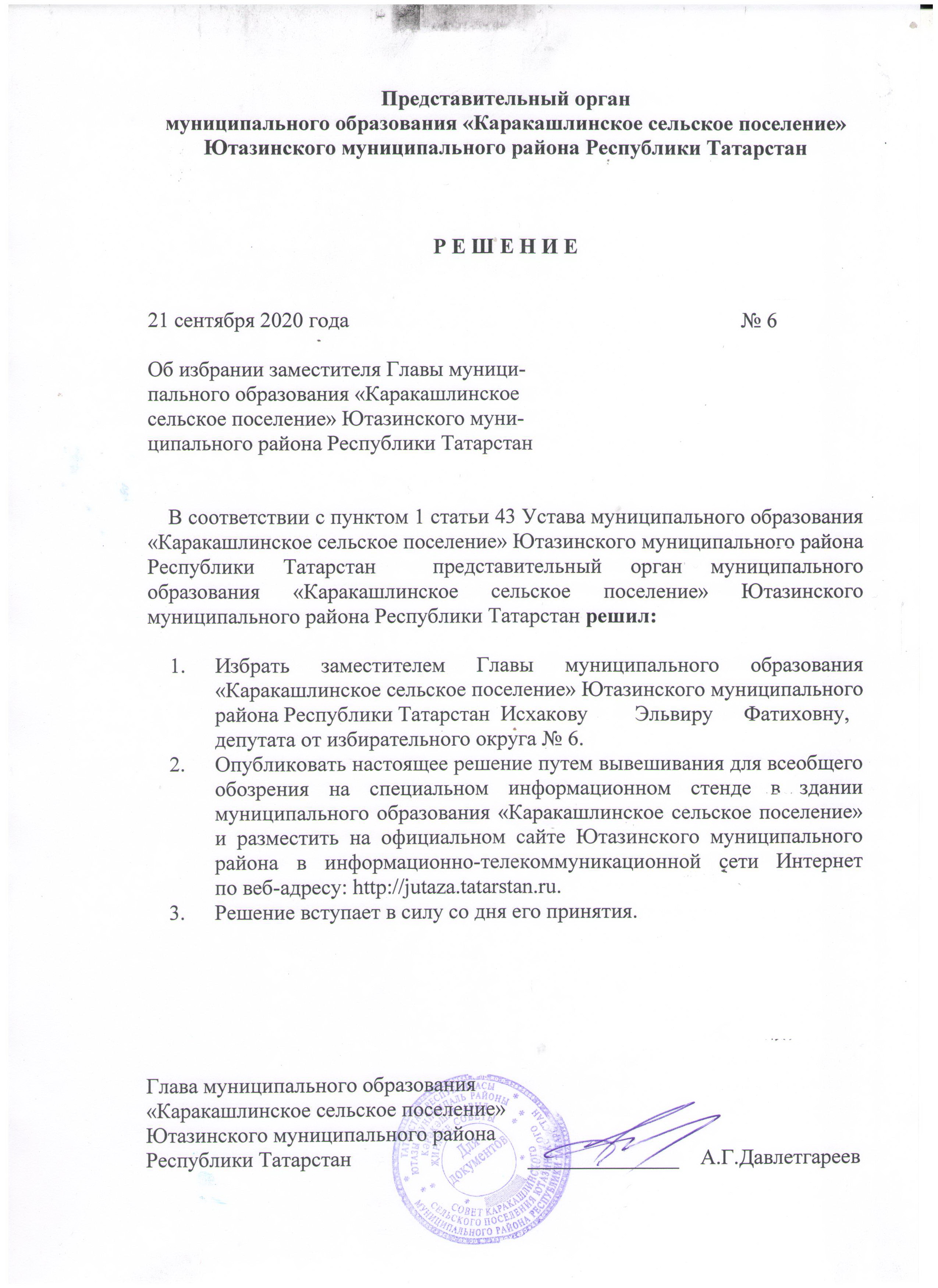 Решение Совета поселения от 21.09.2020г. № 6 «Об избрании заместителя Главы муниципального образования «Каракашлинское сельское поселение» Ютазинского муниципального района Республики Татарстан»