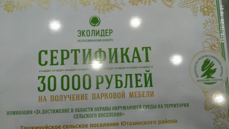 Экологик куркынычсызлык, тирә-як табигатьне саклау һәм яклау кебек сорауларга киң җәмәгатьчелек игътибарын җәлеп итүне максат итеп куйган бәйгедә Ташкичү авыл җирлеге су буйларында узган өмәләрне, чишмәләрне төзекләндерүне, мәктәпкә эшләп килүче экология түгәрәге эшчәнлеген чагылдырган материаллар белән катнаша һәм “Җирле үзидарә органнары” номинациясендә уңышка ирешә. Безнең районның эколидеры Рамил Валеев кичә Казанда узган җиңүчеләрне котлау тантанасында катнашты һәм 30 мең сумлык сертификат белән билгеләнде.