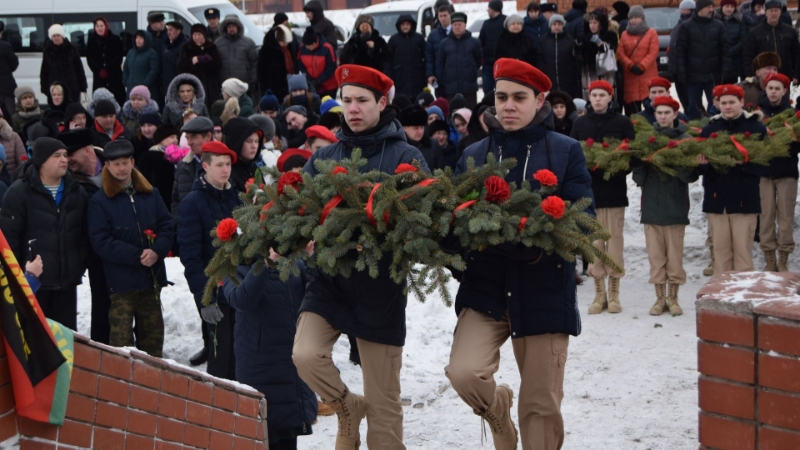 Җыелучылар сугышта һәлак булган солдатларны бер минут тынлык белән искә алдылар һәм һәйкәл янына чәчәкләр салдылар һәм веноклар куйдылар.