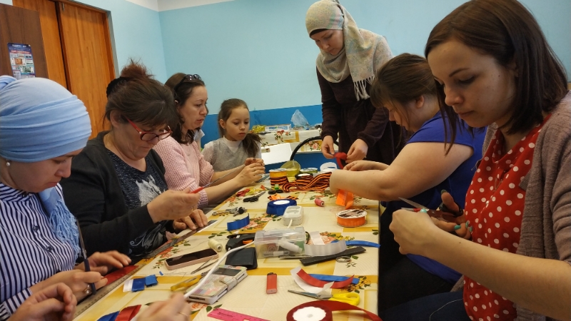 Очрашуның темасы - алда торган бәйрәм - Җиңү көне символикасы тасвирланган беркеткечләр ясау иде. Катнашучылар, Динә Гатиятуллинаның сабыр һәм игътибарлы өйрәтүен тыңлап, үз куллары белән оригиналь һәм матур беркеткеч ясап, җентекле эш башкардылар.