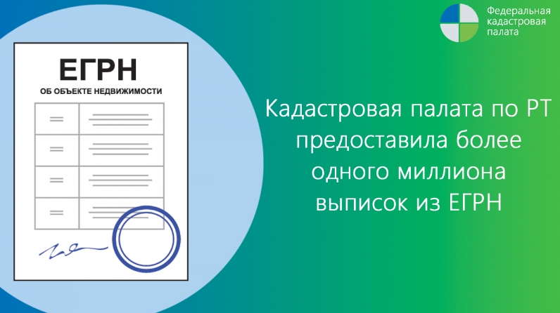 2019 елның гыйнварыннан алып августына кадәр Татарстан Республикасы буенча Кадастр палатасы ЕГРНнан 1,1 миллионнан артык өземтә биргән, бу узган елның шул ук чоры белән чагыштырганда, 35% ка күбрәк. Шунысы игътибарга лаек, шуларның 988 меңнән артыгы электрон рәвештә бирелгән.