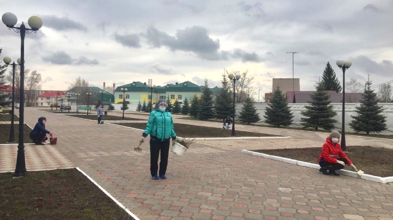 Район Советы һәм Башкарма комитеты көчләре белән район хакимияте бинасы каршындагы территориядә һәм поселокның Урыссу урамында өмә үткәрелде. Хезмәткәрләр агачлар акшарлады һәм бордюрларны буяды.