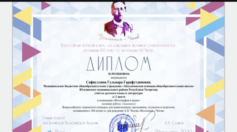 Әбсәләм төп гомуми белем бирү мәктәбенең рус теле һәм әдәбияты укытучысы Сафиуллина Гөлнара Гарәфетдин кызын һәм укучыларның иҗади коллективын А.П. Чеховның тууына 160 ел тулу уңаеннан уздырылган мәктәпкәчә яшьтәге балалар, мәктәп укучылары, студентлар һәм педагоглар өчен үткәрелгән Бөтенроссия иҗат конкурсында «Фотосурәтләр һәм видео» номинациясендә җиңүләре белән котлыйбыз.